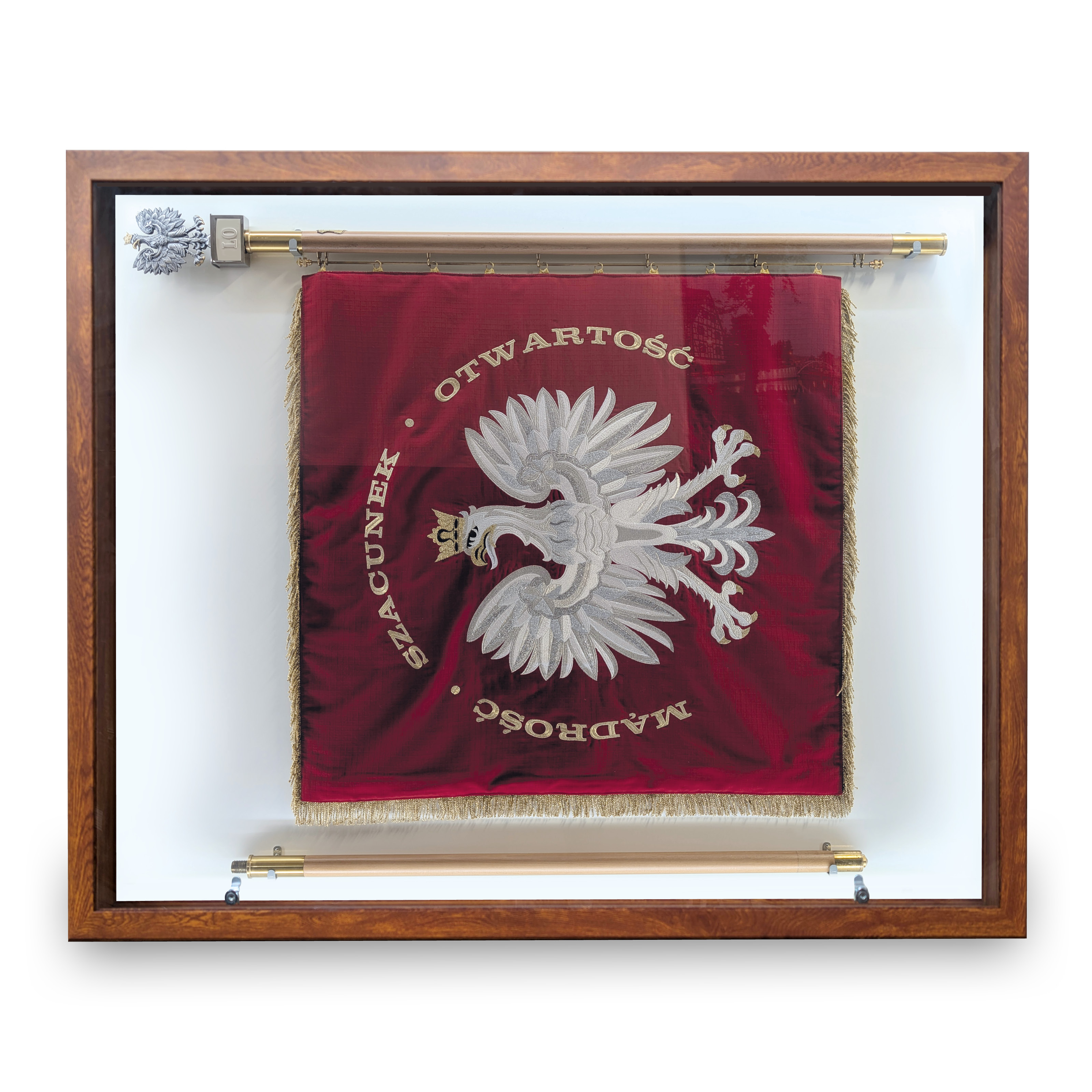 - Duża głębokość użytkowa gabloty (110 mm) pozwala na bezpieczną i swobodną ekspozycję sztandaru. Haki podtrzymujące elementy sztandaru są nitowane do stalowej blachy tworzącej tył gabloty. Ten sposób montażu gwarantuje stabilną i trwałą podporę dla ważącego wraz z drzewcem kilka kilogramów sztandaru. Na podstawie wymiarów przesłanych przez klienta, indywidualnie do każdego sztandaru, nitujemy haki w naszej fabryce. Klient wcześniej otrzymuje szczegółową instrukcję jak powinien zwymiarować swój sztandar aby haki